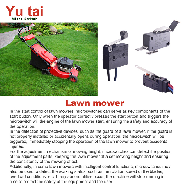 4. Safety protection function of the waterproof microswitch: It can detect the operating status of the lawnmower. When the user leaves the operating area or an abnormal situation occurs, it can immediately cut off the power supply and stop the lawnmower to prevent accidents. Circuit control function: The lawnmower needs circuit control to achieve functions such as starting, stopping, and speed adjustment. The waterproof microswitch can sense operational commands, quickly transmit signals, and control the start or stop of the lawnmower's motor. Fault detection function: The waterproof microswitch can detect the operating status of the lawnmower, promptly identify faults such as motor overheating or wire short-circuiting, and alert the user to perform maintenance and repair by cutting off the power and issuing an alarm.